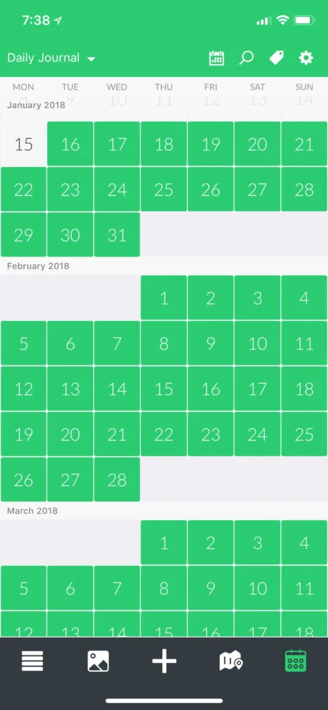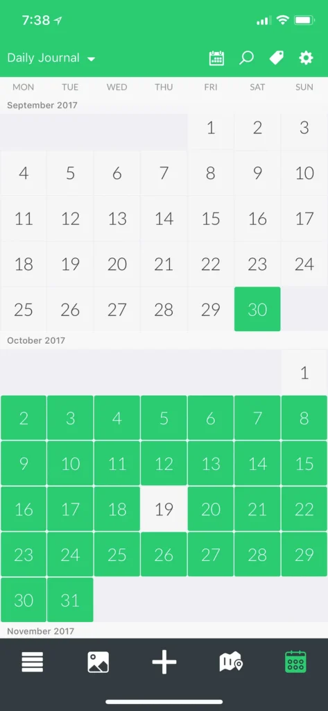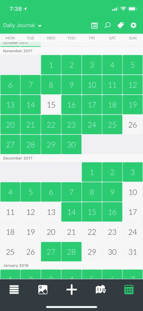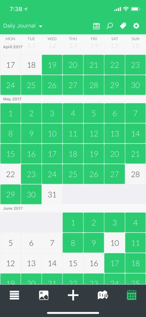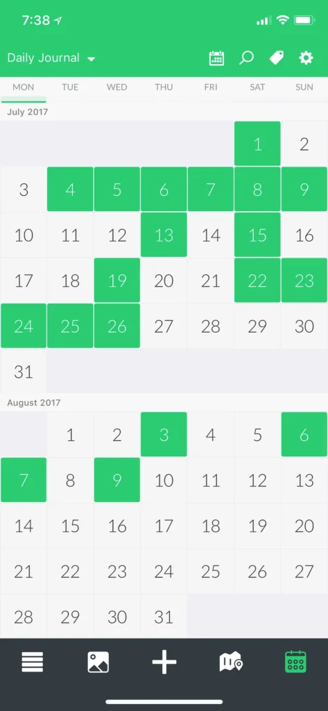 The dates highlighted in green represent the dates on which I have made at least one entry in the journal.