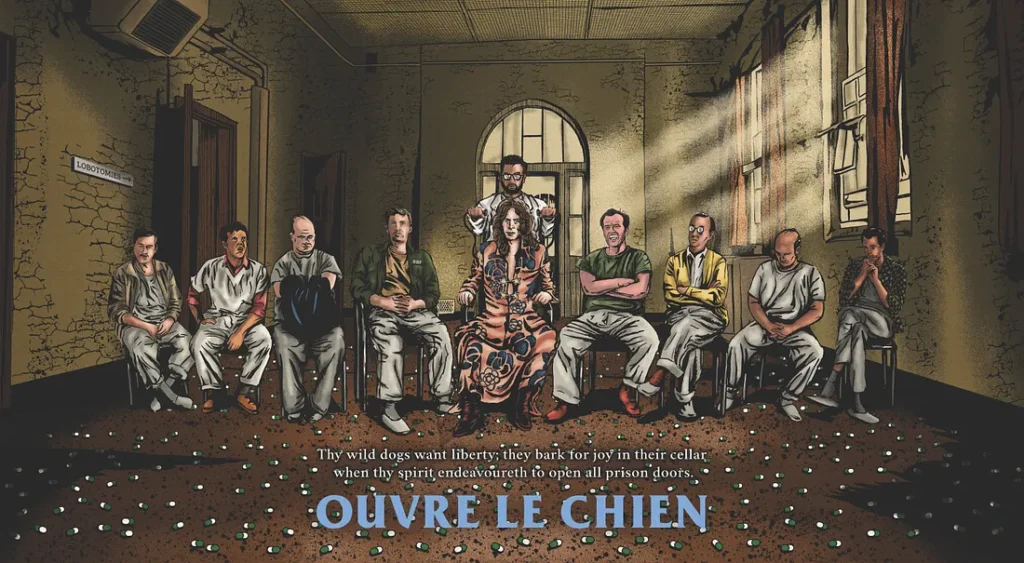- There’s a sign that reads “lobotomies” on the left wall — this is referenced in the song, and also has a connection to One Flew Over the Cuckoo’s Nest.