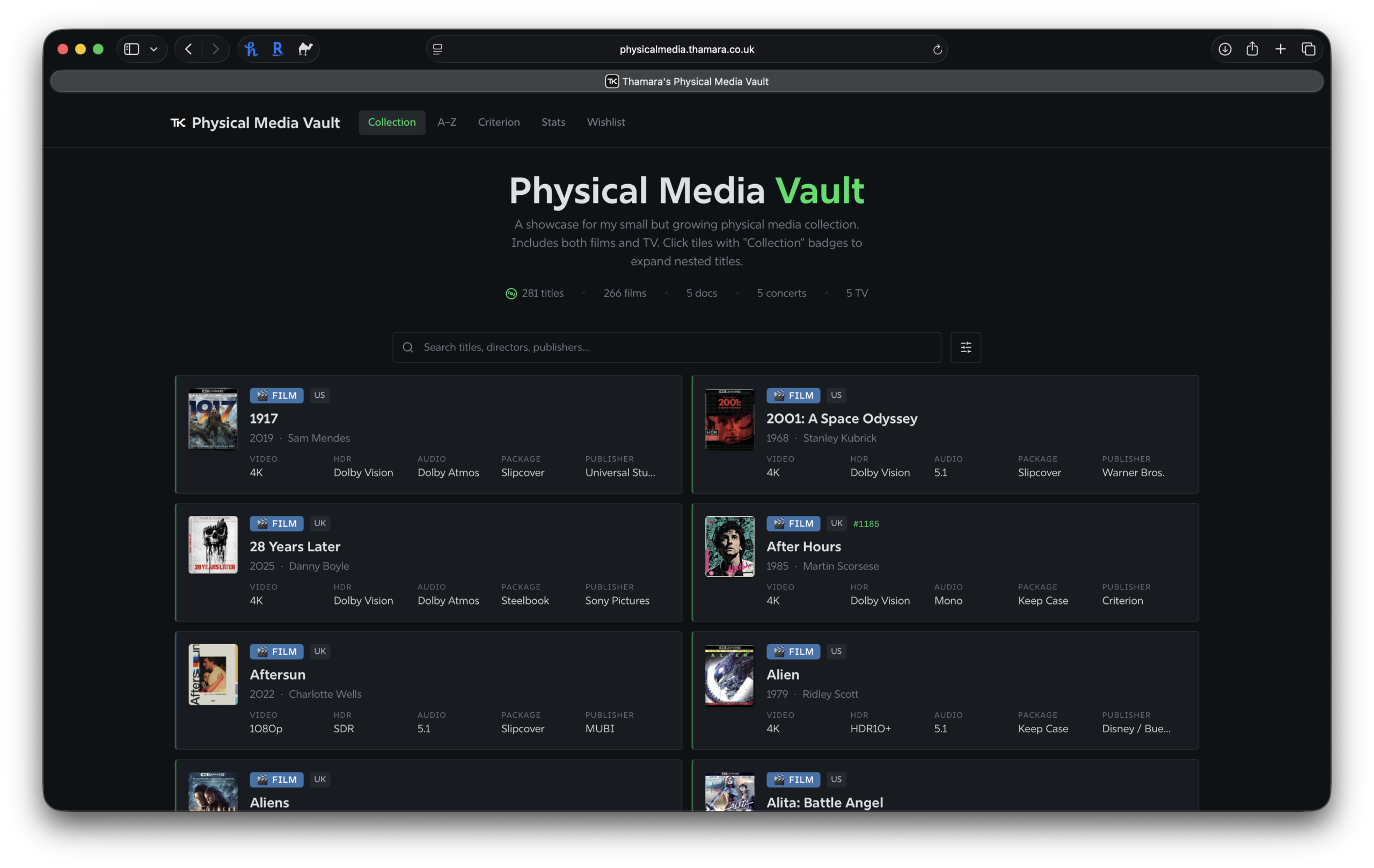 Over several days and close to 200 iterations, I built a simple, multi-page app tailored to my exact needs. I hosted it on the subdomain physicalmedia.thamara.co.uk, and this is what it looks like.