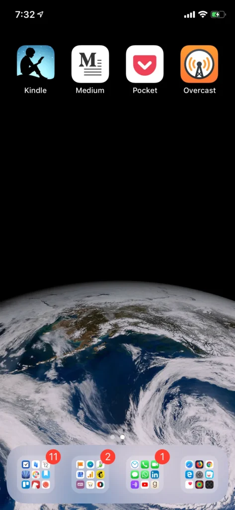 I want to read more this year, so I’m placing my favorite reading apps within easy grasp. Kindle, for my books, Medium, where I follow a number of amazing writers and Pocket, where I save my favourite articles from all over the internet to read later, will be front and centre on this screen.